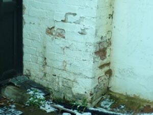 Finally the external ground levels had been built up over the years to the extent that they were now higher than the internal floor level, encouraging water ingress above floor level.