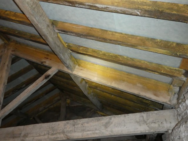 There was yellow staining to most of the timbers just below the roof line, as well as some visible decay to some roof timbers. We even saw decay on newer, replacement timbers that had been installed when the roof covering was replaced. It appears that spray foam insulation had been removed, possibly because of decay to the roof timbers.