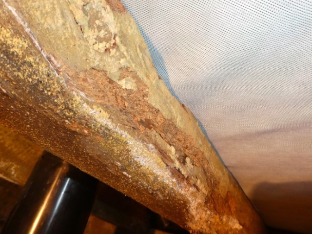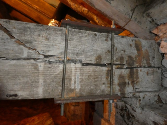 There was some damage to the roof frame. Steel plates had been clamped around a crack in the structural timber of a King post frame. While it is likely that this historic repair would not meet current standards of repair, it had not moved and was continuing to provide support to the damaged timber.
